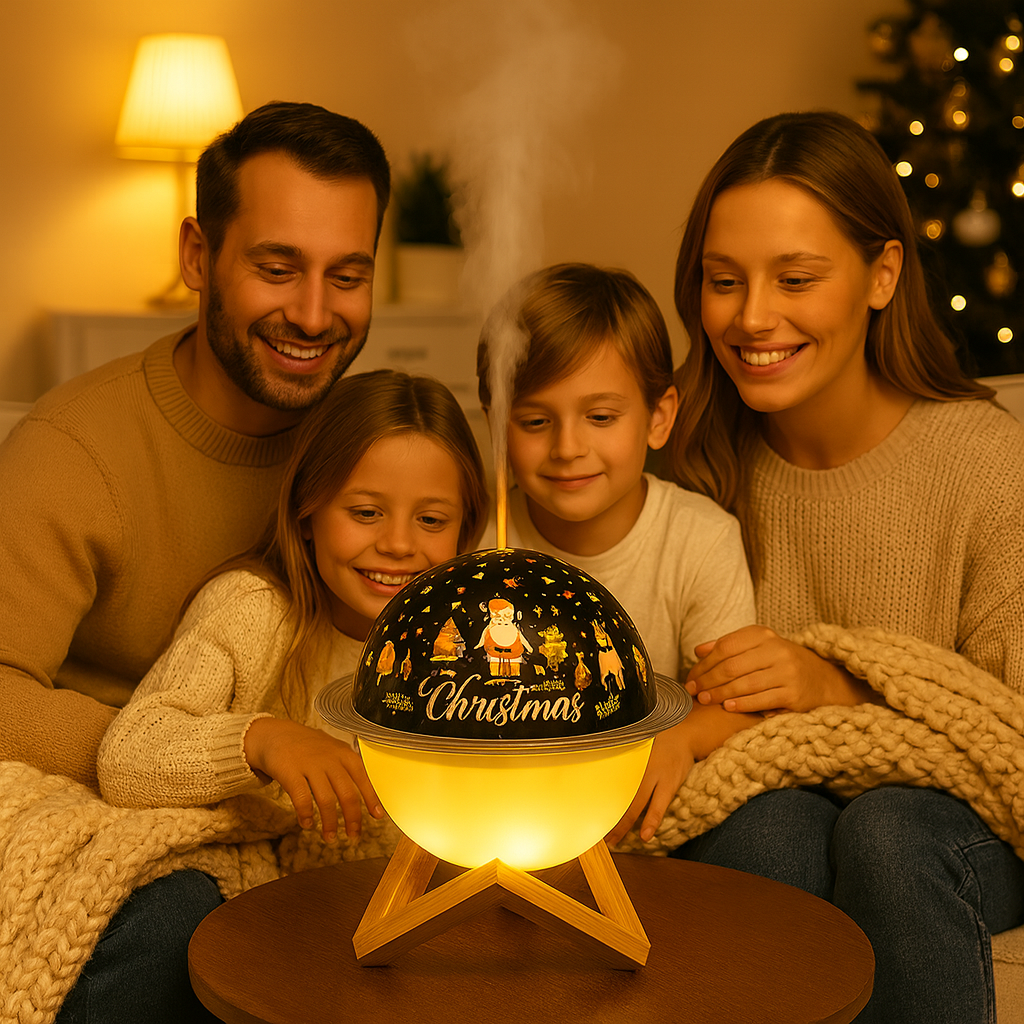 Gracias a su doble función —lámpara proyector + humidificador aromático— este pequeño planeta se convierte en un imprescindible de la temporada. No solo decora: crea un ambiente navideño completo, elegante y acogedor.